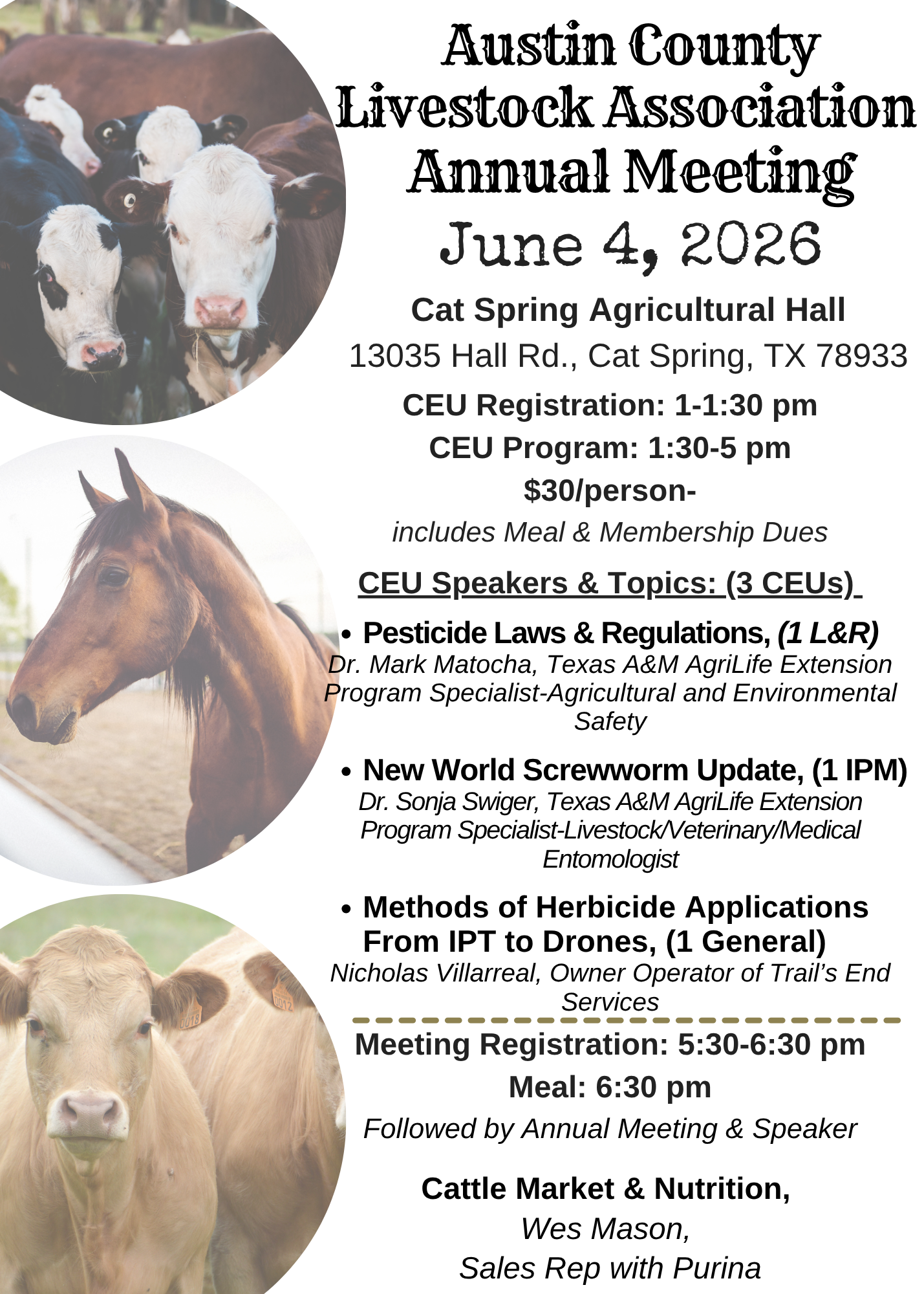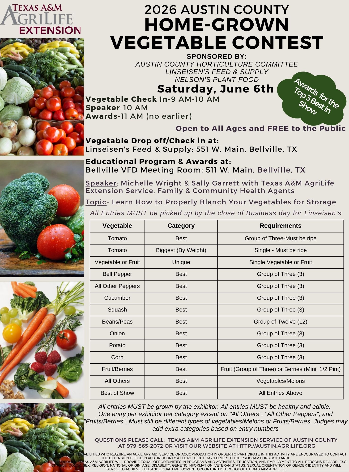 The Bluebonnet Master Gardeners of Austin County are pleased to present the 2026 “Lunch-N-Learn” series which will be hosted on the third Tuesday of each month from January through May. Overall, the series will feature topics related to horticulture with homeowners and backyard gardeners in mind. The speakers are experts in their fields and practical gardeners with great tips and information for everyone. Programs will be held at the Texas A&M AgriLife Extension office located at 800 E Wendt St, Bellville. Doors will open with registration beginning at... Read More →